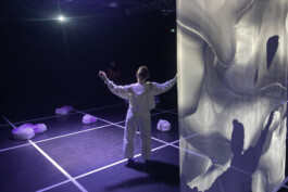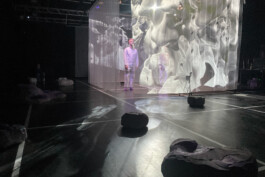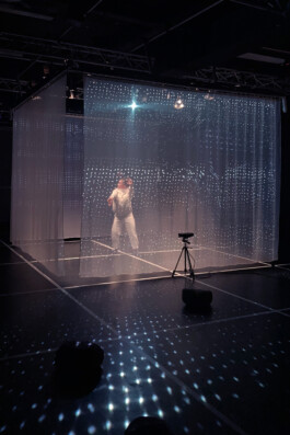 Large semi-transparent fabric walls serve as projection surfaces. These can be opened and closed by remote control, so that the spatiality and thus the axes of vision are constantly changing.