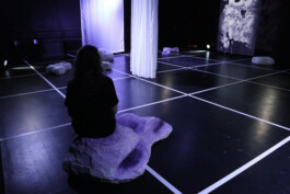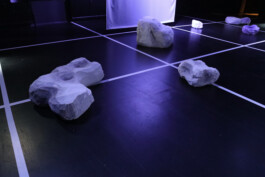 The piece works with live generated images of the performers. These are then translated again from the digital into the physical space and are found as "body structures" in the space. These serve as mobile seating elements and can be moved by visitors.